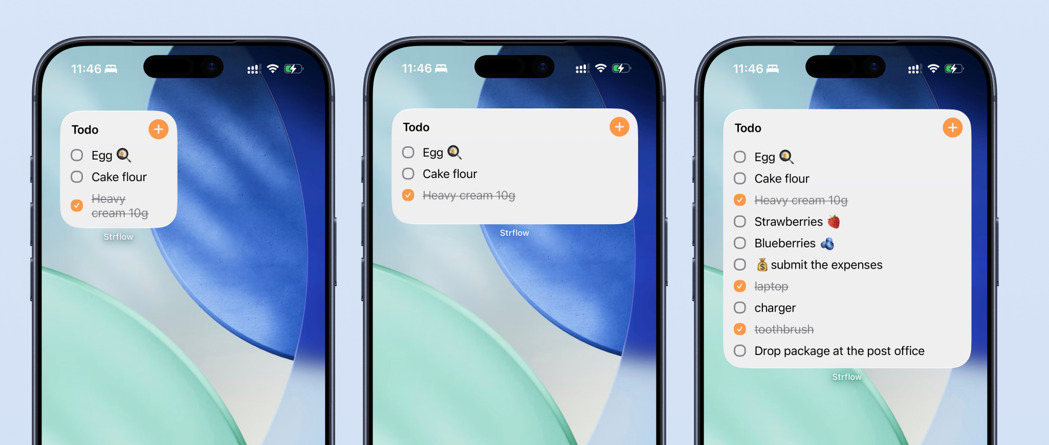 This widget extracts your recent todos and displays them as a checklist. You can check items off directly in the widget without opening the app.